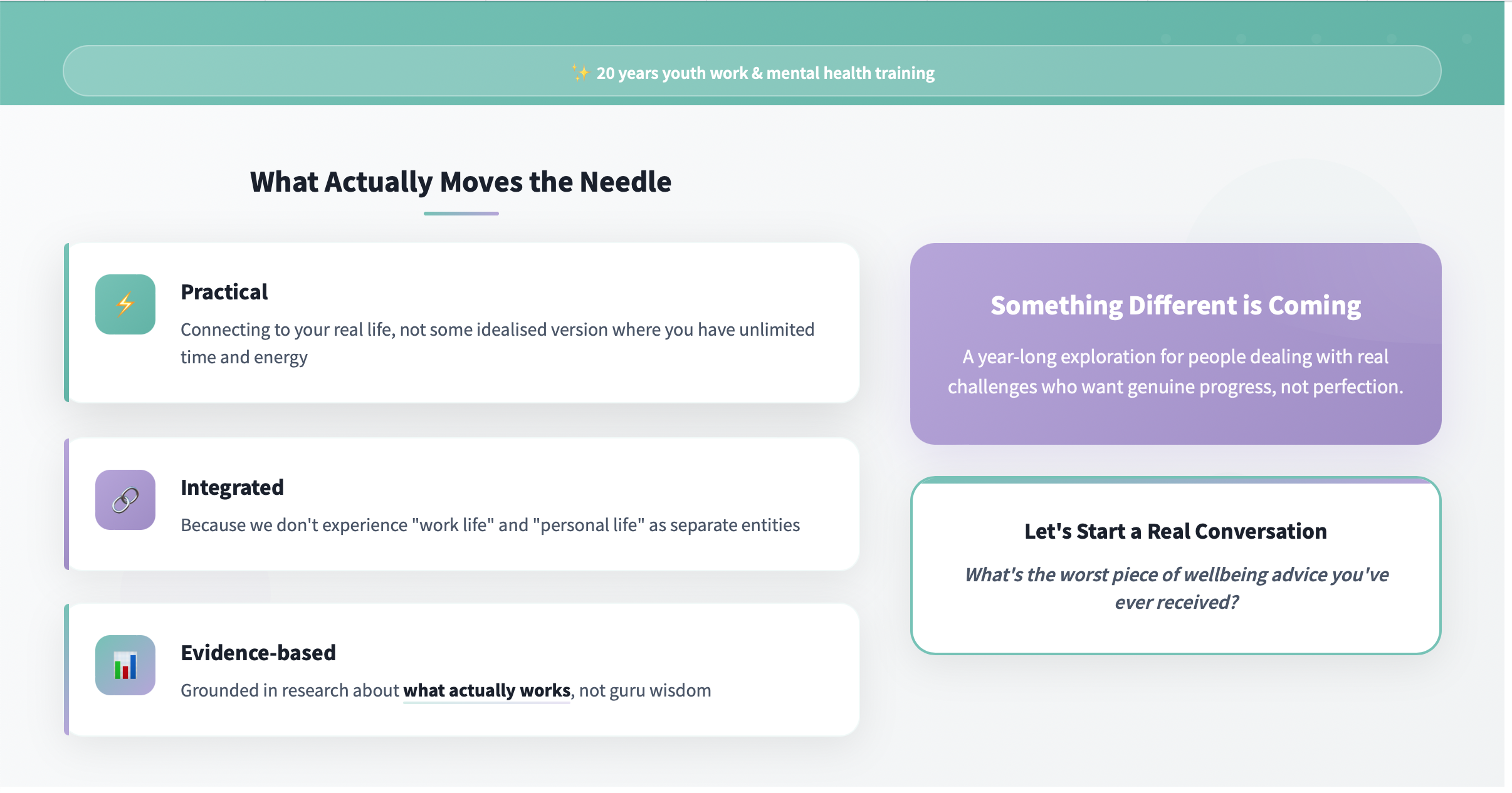 I'm working on something that brings all three together. A year-long exploration for people dealing with real challenges who want genuine progress, not perfection.